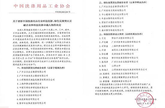 关于表扬中国洗涤用品行业科技立异、绿色生长突出孝顺企业和科技立异卓越人物的决议...